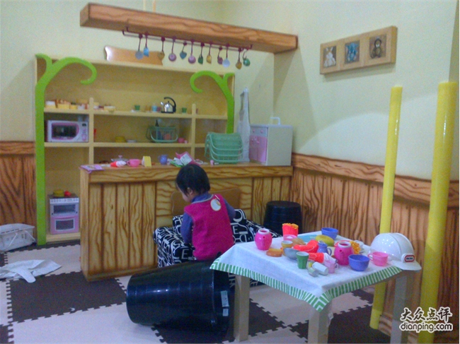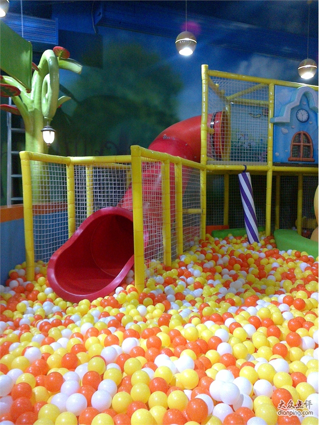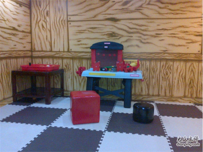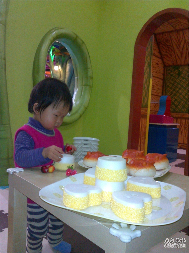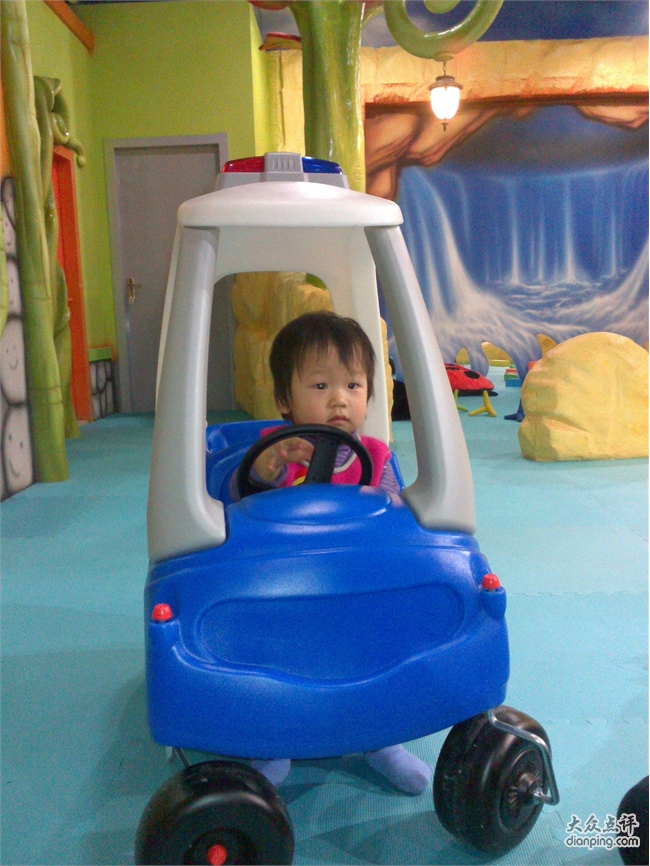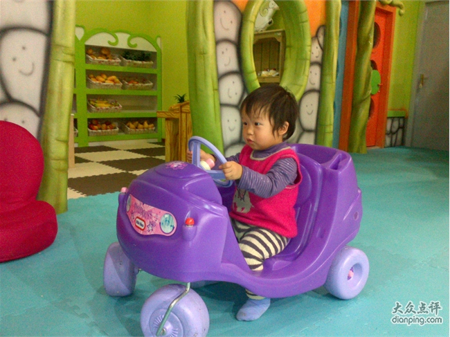 嘟噜岛分了几个区域,一片搭积木的场地,几个连着的小屋子分别是客厅,工作间和超市。客厅里有招待客人用的全套用具,小朋友可以在这里过家家做饭一起喝茶吃 吃汉堡。工作间里有个LITTLE TIKE的工作台,适合想当工程师的小朋友装装螺丝搞点小修理啥的,这里还有一台一弹就有泡沫粒蹦跳的钢琴,很震撼哦。超市里有蔬菜水果和面包,可以模仿超市购物的场景,很有意思。还有一大片区域是海洋球,滑梯,还有球球发射器。唐宝这个年龄的孩子,只对海洋球和滑梯有兴趣,大一些的孩子则疯狂喜欢用发射器把球打得满天乱飞。这里觉得稍微有点不合理,虽然球本身很软,从很高的地方打出来加上发射的力量,砸到海洋球里玩的孩子应该还是会有点小痛吧。最好像豆豆家那样,把球球发射器放在相对封闭的空间里。嘟噜岛里有趣的一点是在空的区域里放了一些宝宝们依靠双脚能发动的小车,唐宝喜欢的不得了,换了好几辆车开的不亦乐乎。